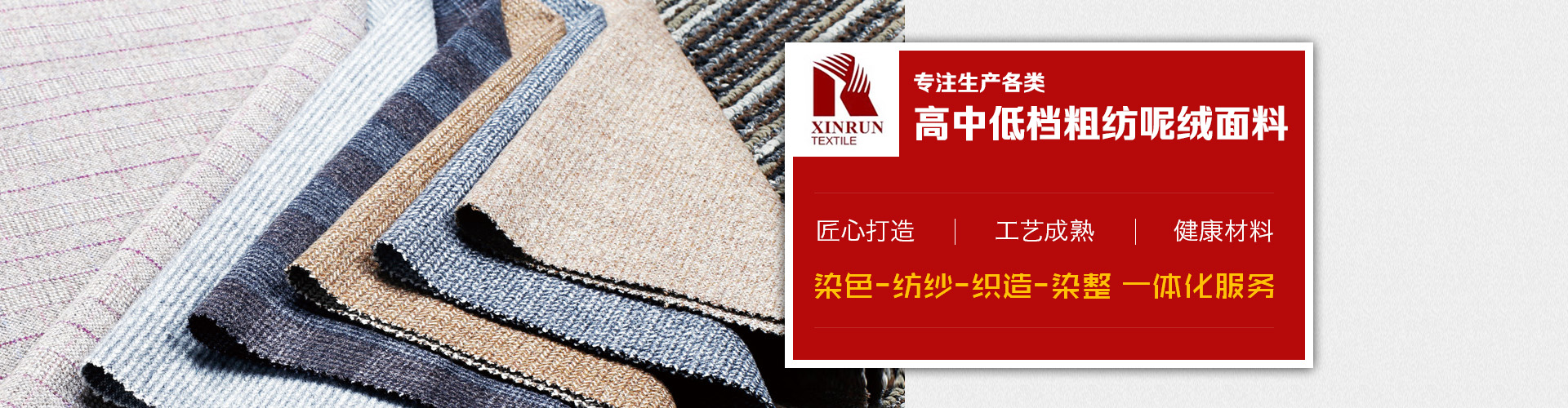 主要產(chǎn)品有:法蘭絨、麥爾登,立絨,順毛,兔羊絨,阿爾帕卡,雙面呢,格呢,斜紋呢、圈圈呢、針織毛呢,臺(tái)球呢和地毯等幾百個(gè)品種以及上千個(gè)花色,另外新開(kāi)發(fā)特種花式紗面料、復(fù)合,印花,扎染,涂層,貼膜,防水,防靜電等各類功能型面料。